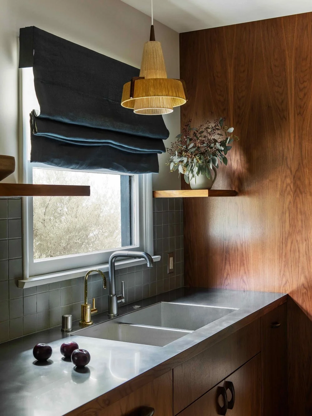 Traditionally, it's common to maintain consistency in plumbing fixtures while adding accents through hardware or lighting. However, in this remarkable mid-century kitchen design by Corinne Mathern, something truly unique was achieved. The stainless steel countertops and undermount sink were seamlessly blended with a striking combination of a brass cold water dispenser and a stainless kitchen faucet, resulting in a truly exceptional aesthetic.