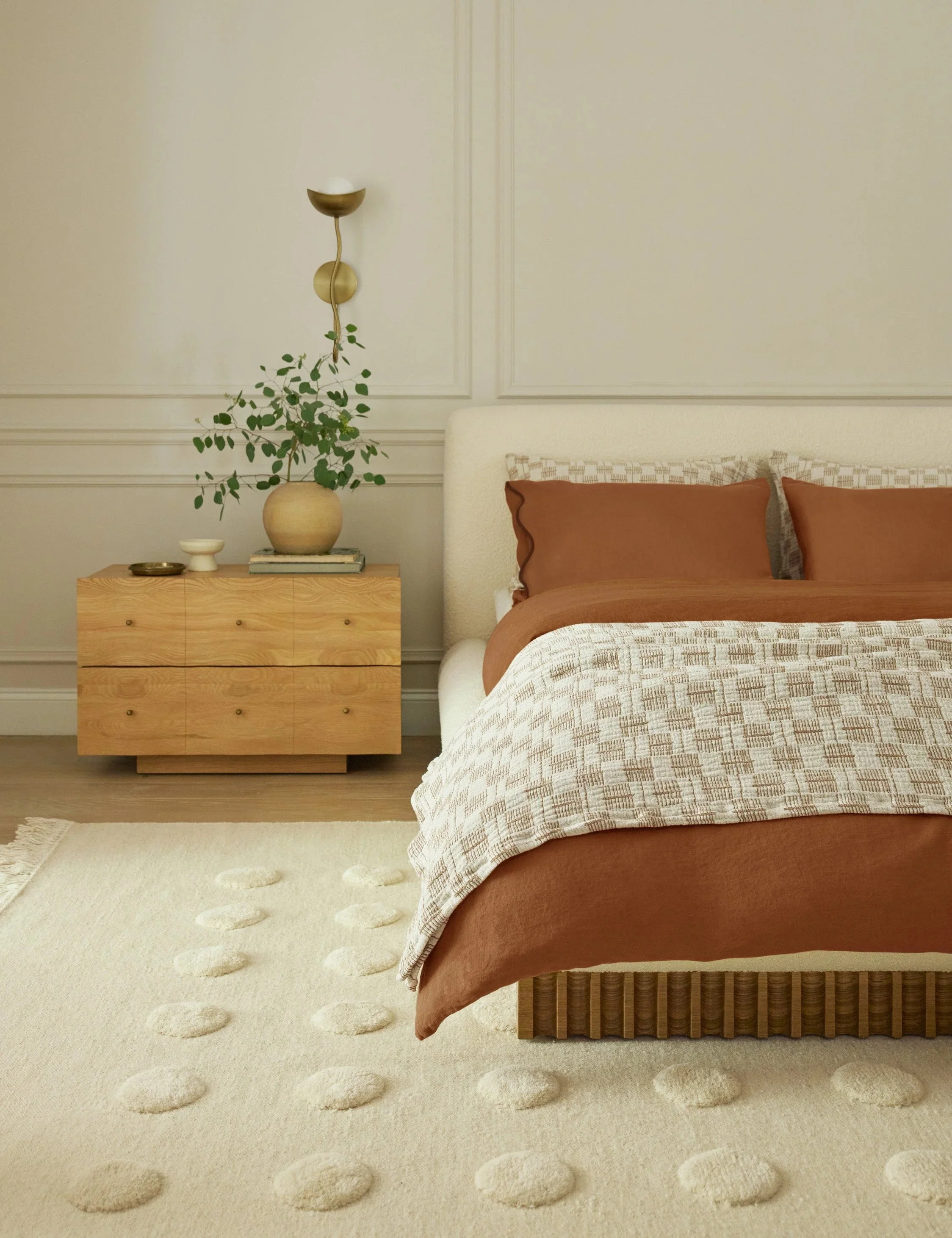 Linen has earned its place as a classic material for bedding thanks to its effortless texture, natural softness, and visual appeal. It’s looser in weave, which helps regulate temperature, and has a slightly rumpled look that’s beloved for its lived-in feel.